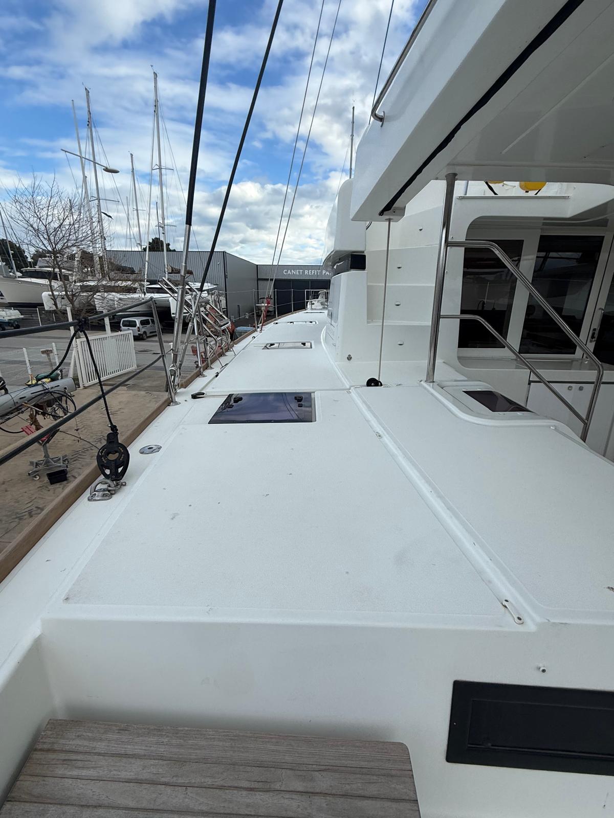 [Version 5 cabines] à babord vous retrouverez 2 cabines doubles avec salle d’eau privative et à tribord depuis le cockpit un accès à une cabine doubles avec sa salle d’eau, puis depuis le salon intérieur l’accès à une cabine doubles et une cabine avec 2 lit superposés