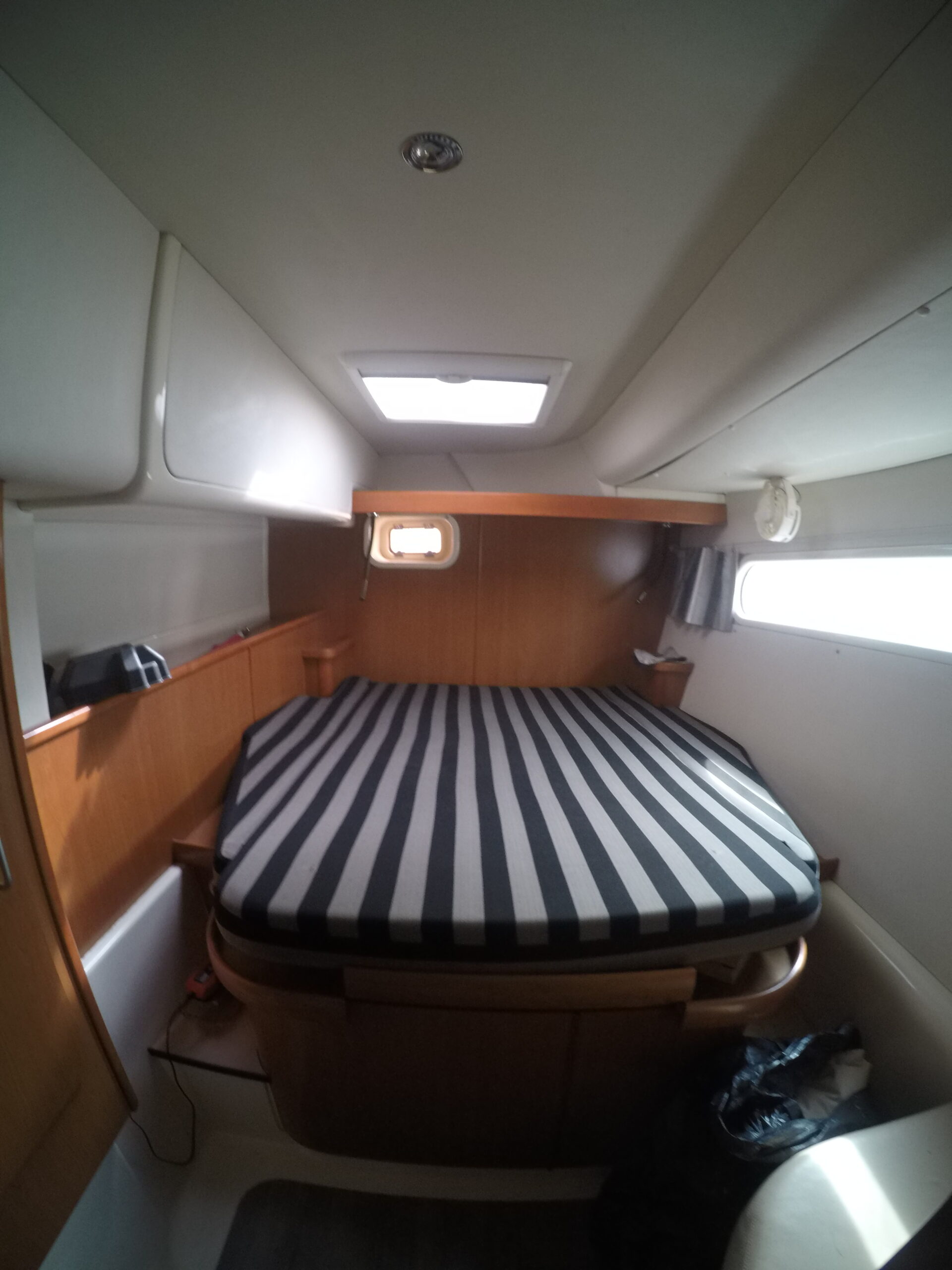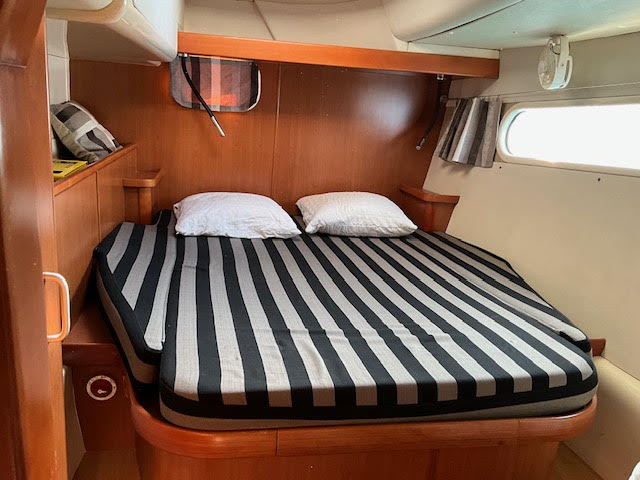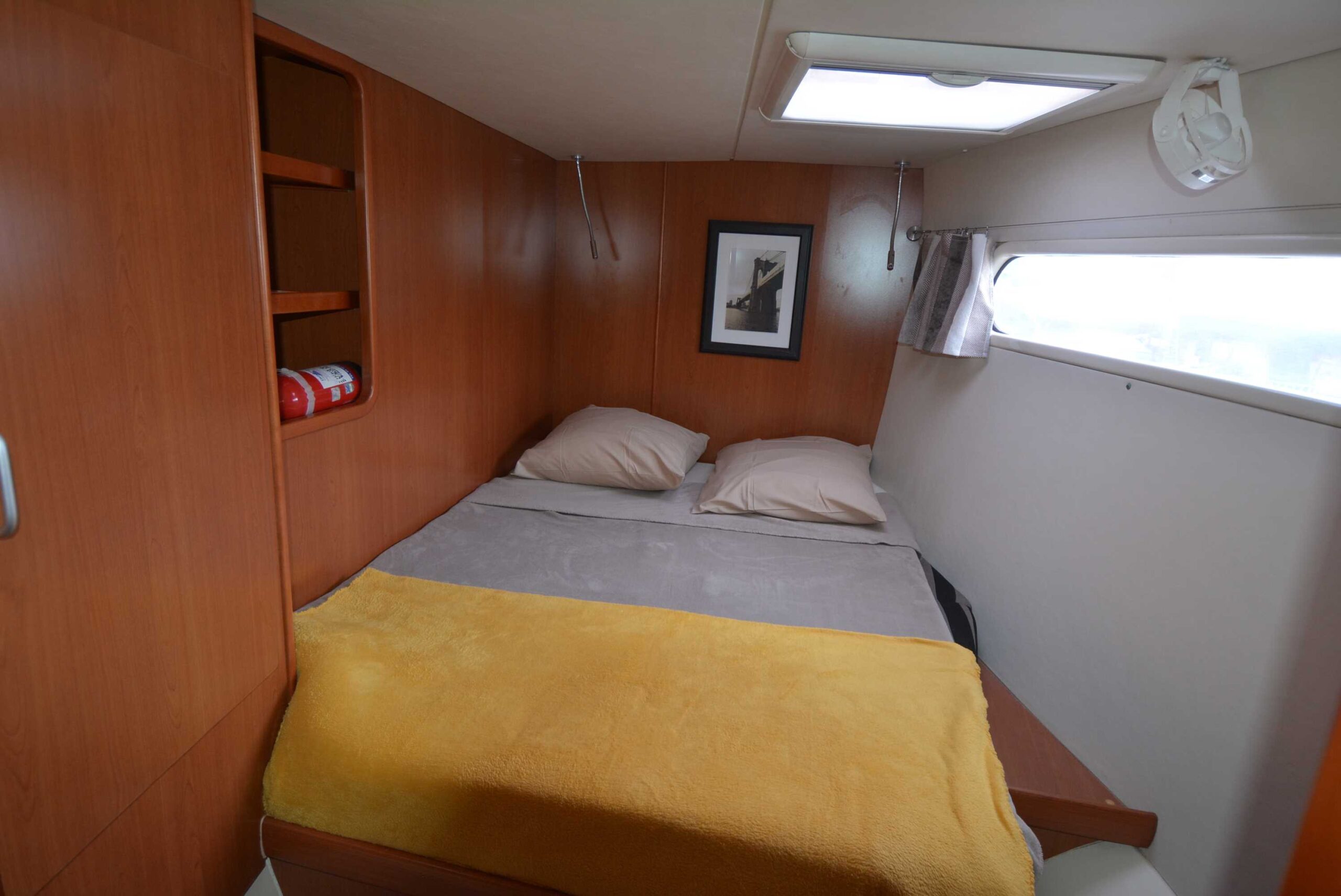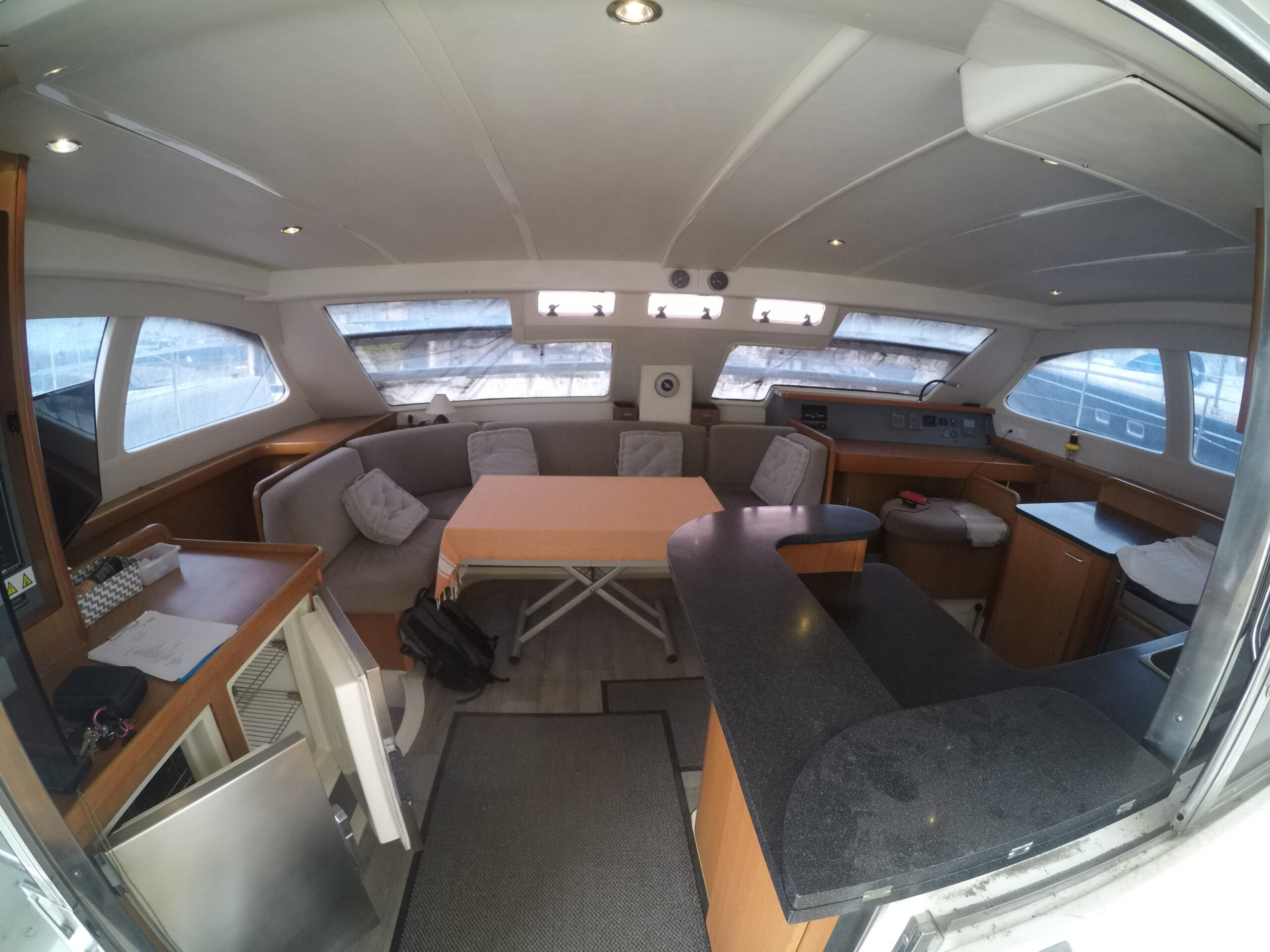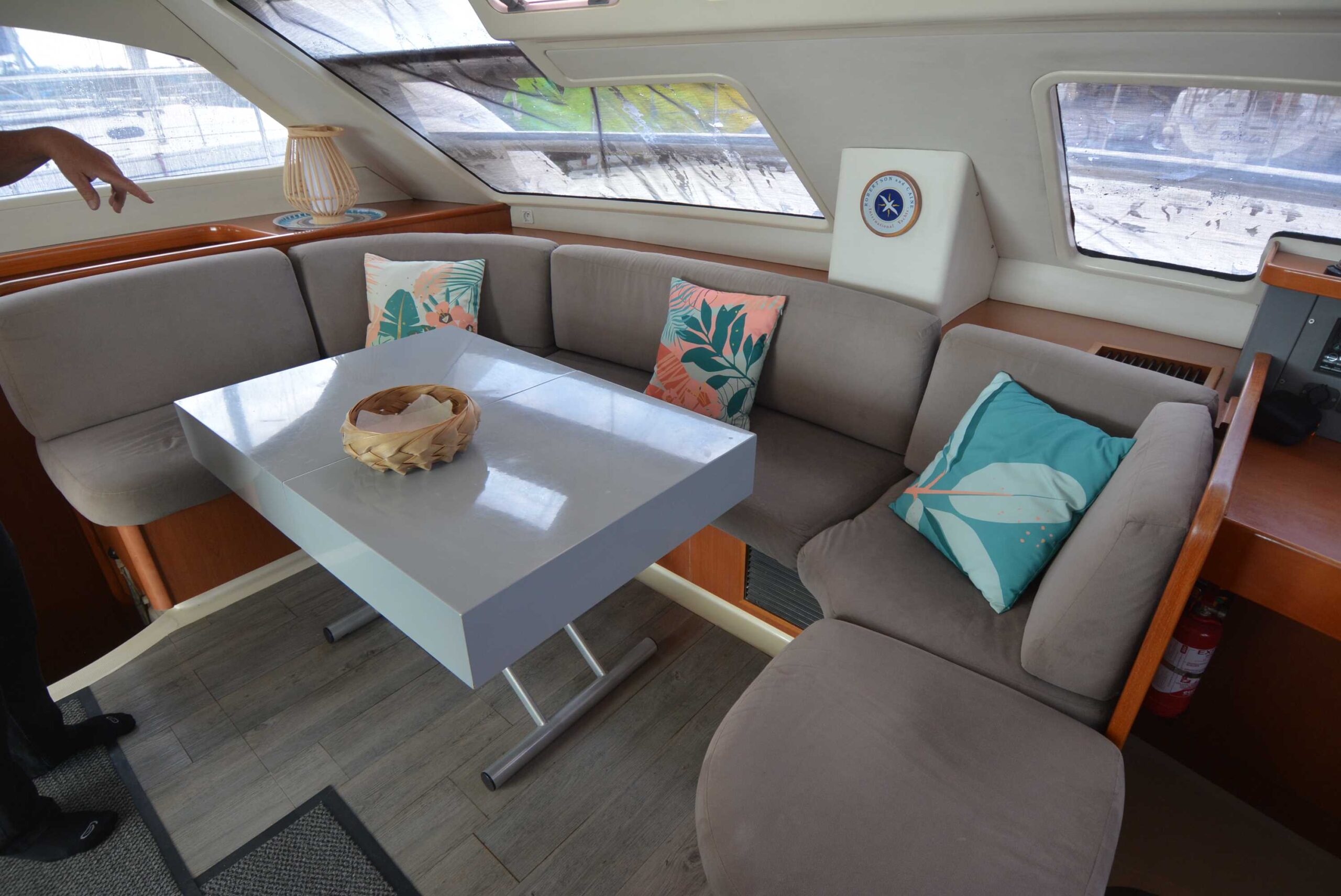 Le salon, lumineux et spacieux, bénéficie de larges ouvertures offrant une vue panoramique et une belle luminosité naturelle. Les cabines sont confortables et adaptées à la vie à bord sur de longues périodes.