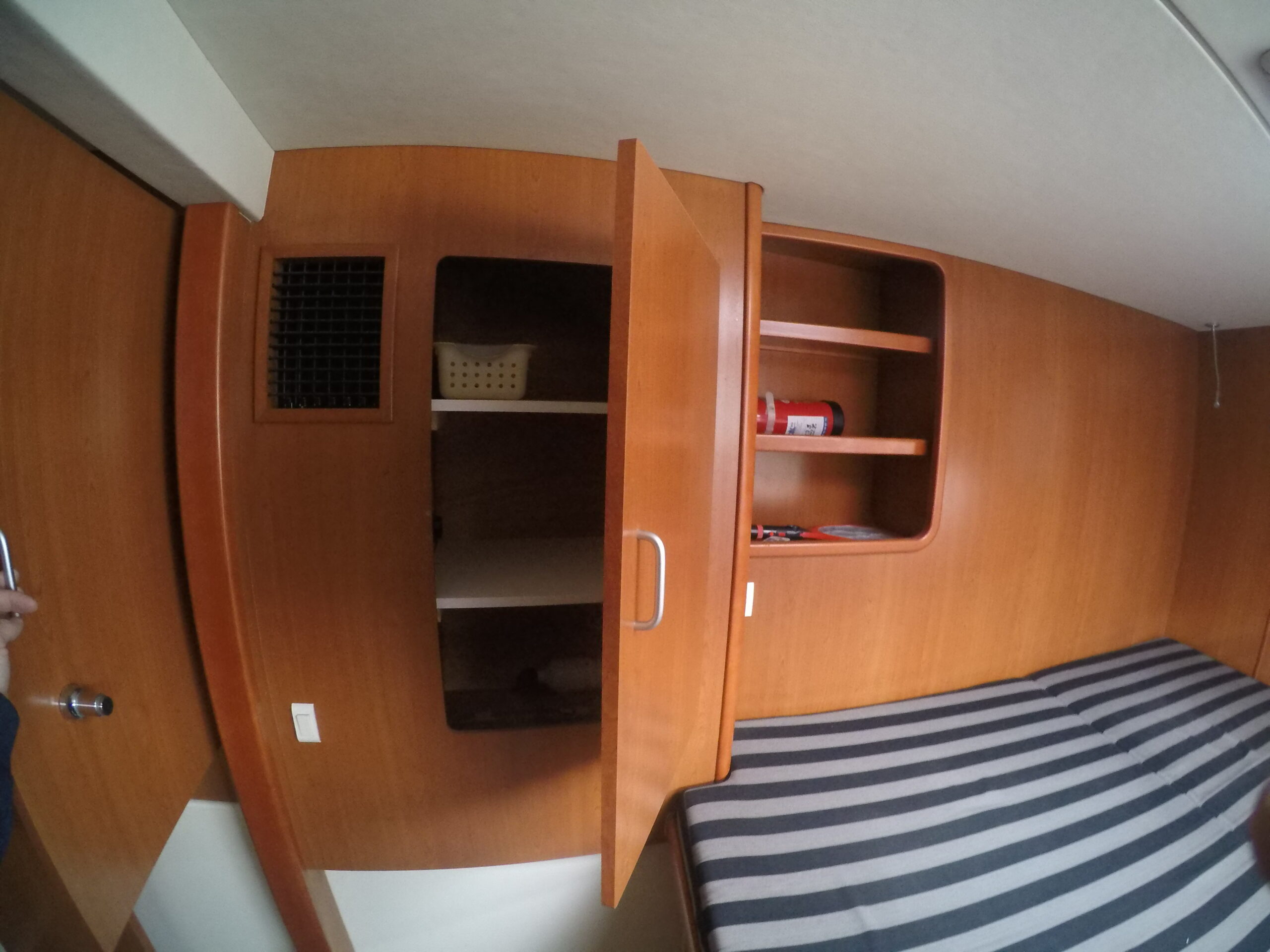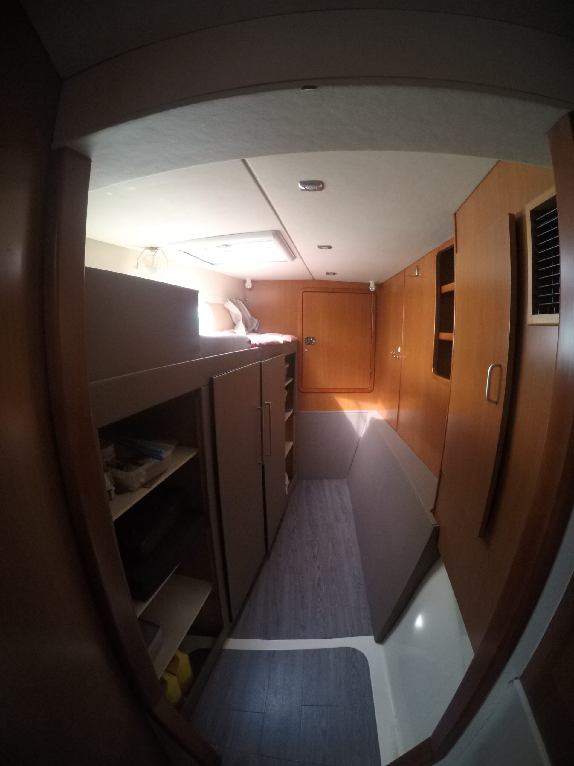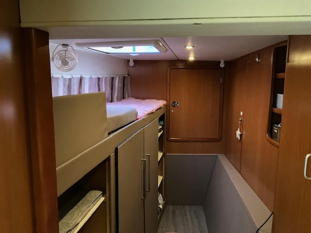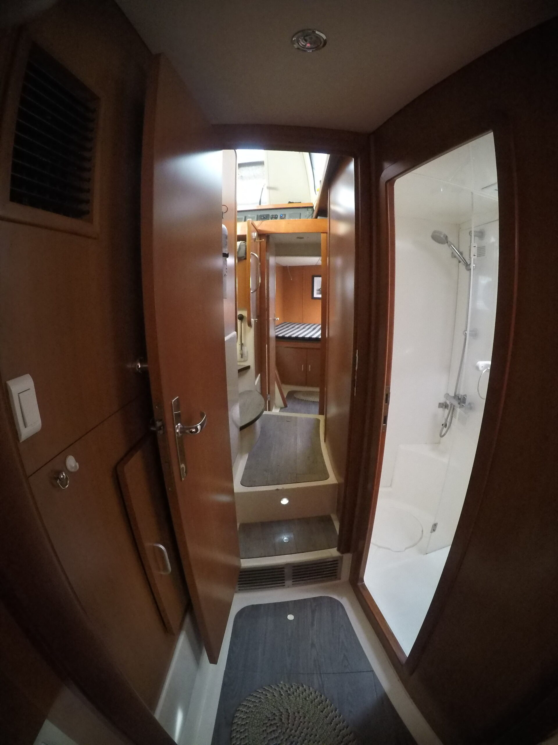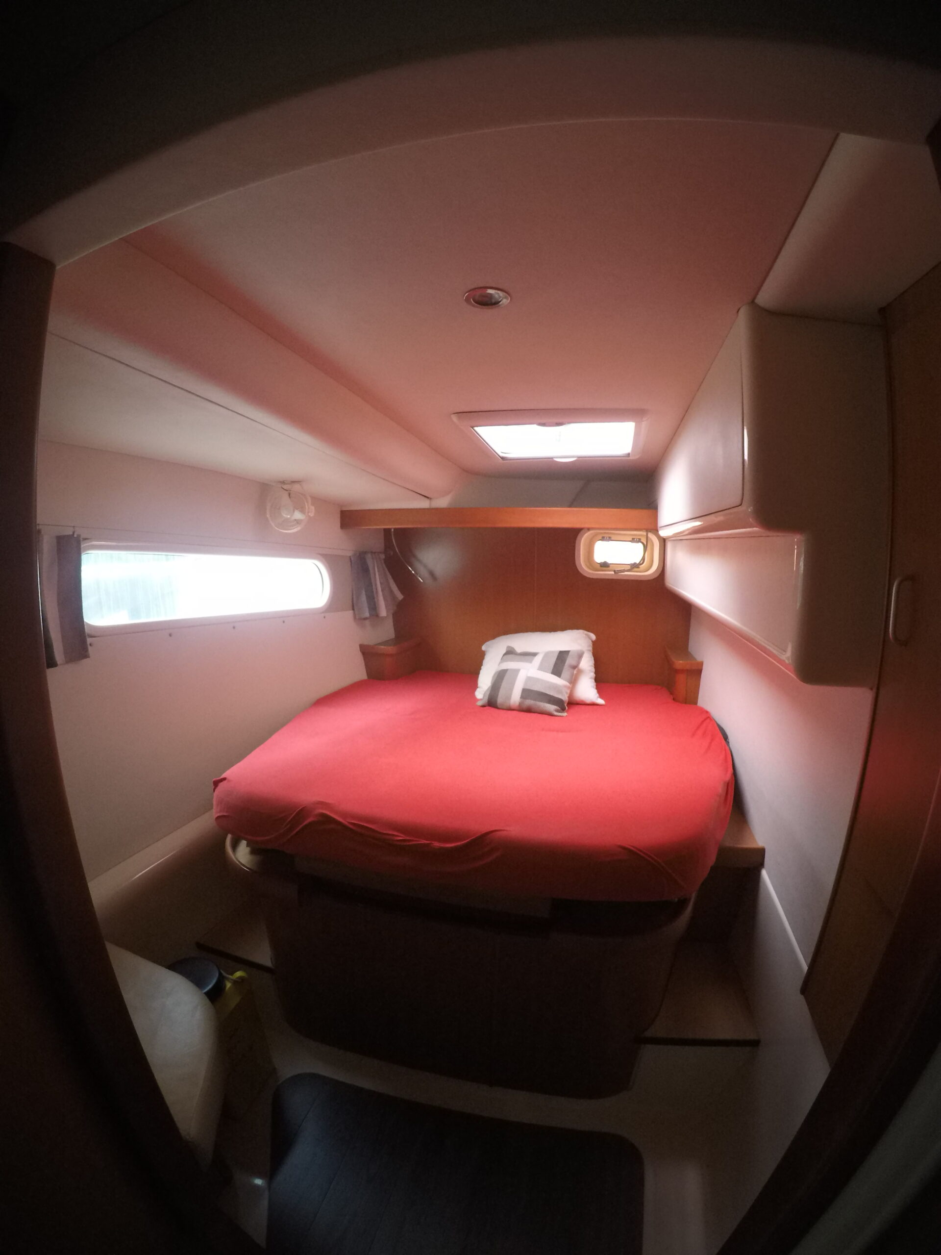 Le salon, lumineux et spacieux, bénéficie de larges ouvertures offrant une vue panoramique et une belle luminosité naturelle. Les cabines sont confortables et adaptées à la vie à bord sur de longues périodes.