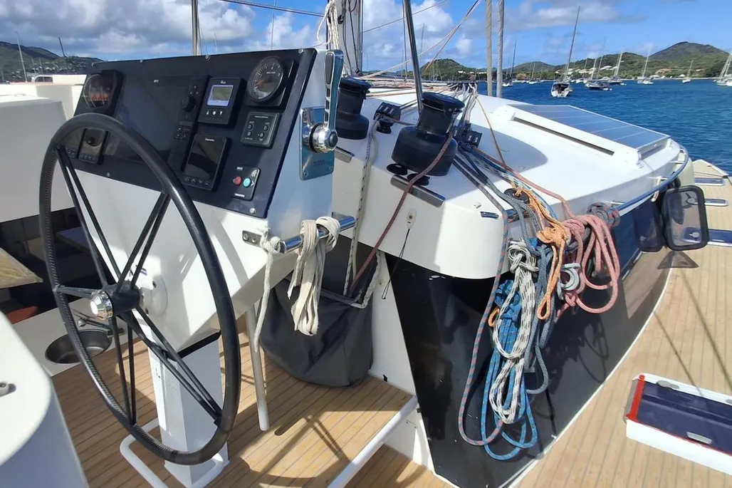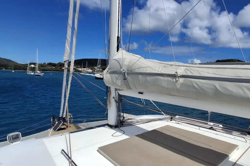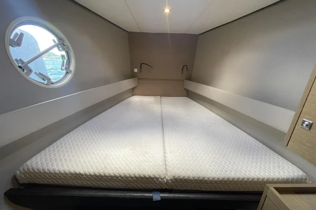 Une cabine double dans la coque bâbord avec salle de douche équipée d’une douche, d’un lavabo et d’un toilette électrique