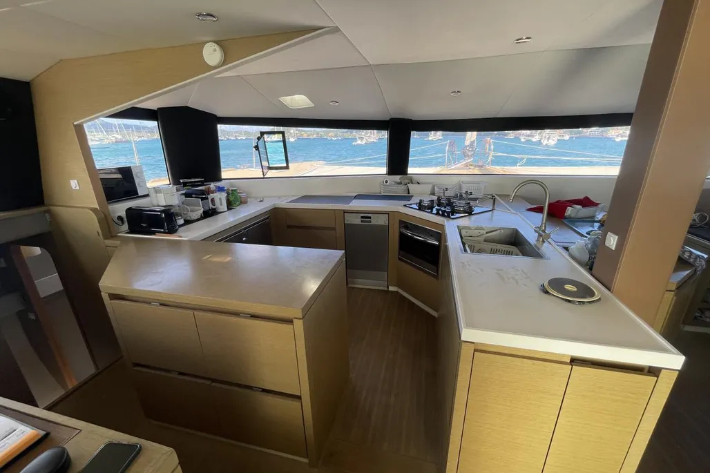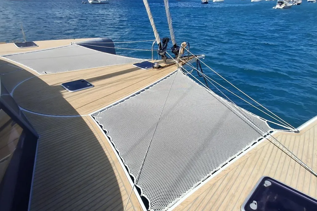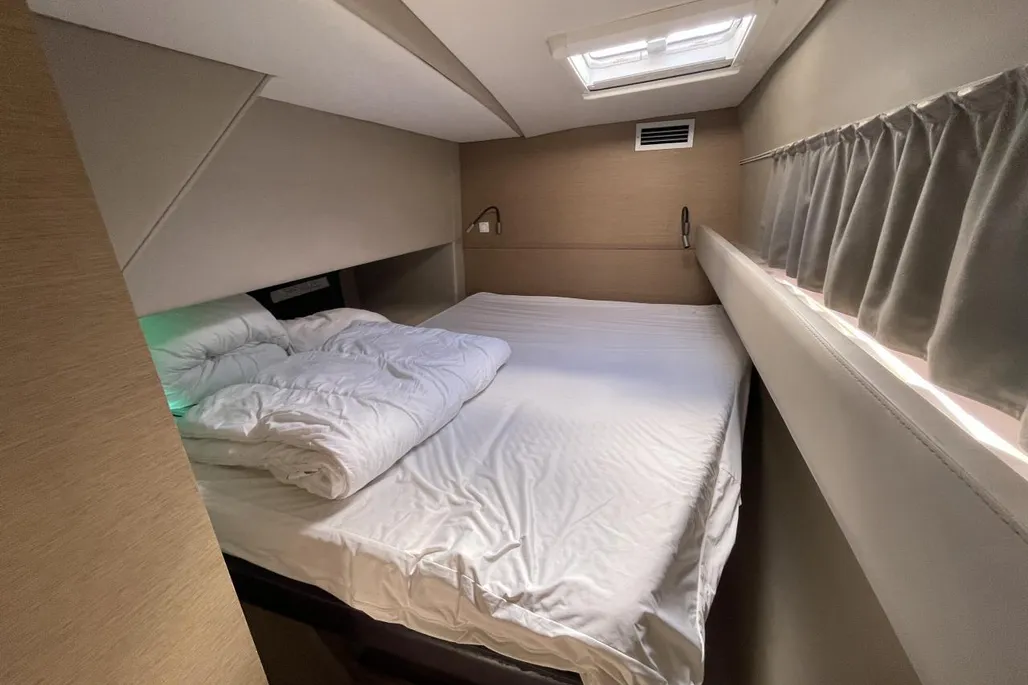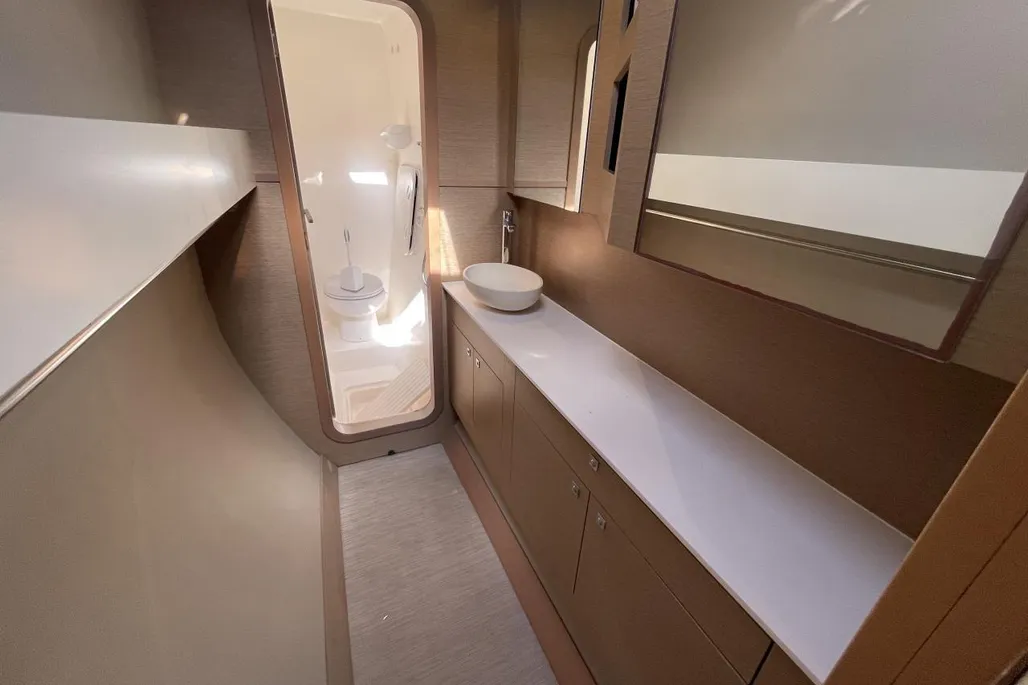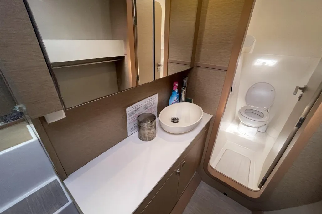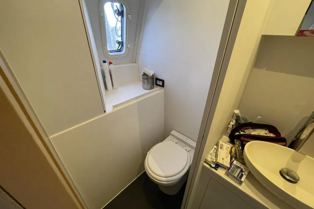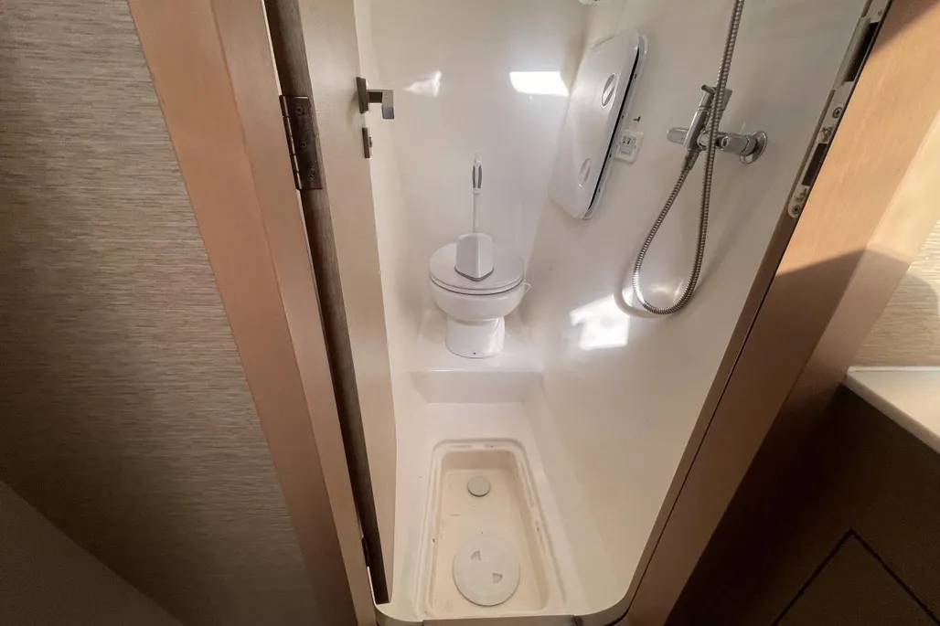 Une cabine double dans la coque tribord avec salle de douche équipée d’une douche, d’un lavabo et d’un toilette électrique