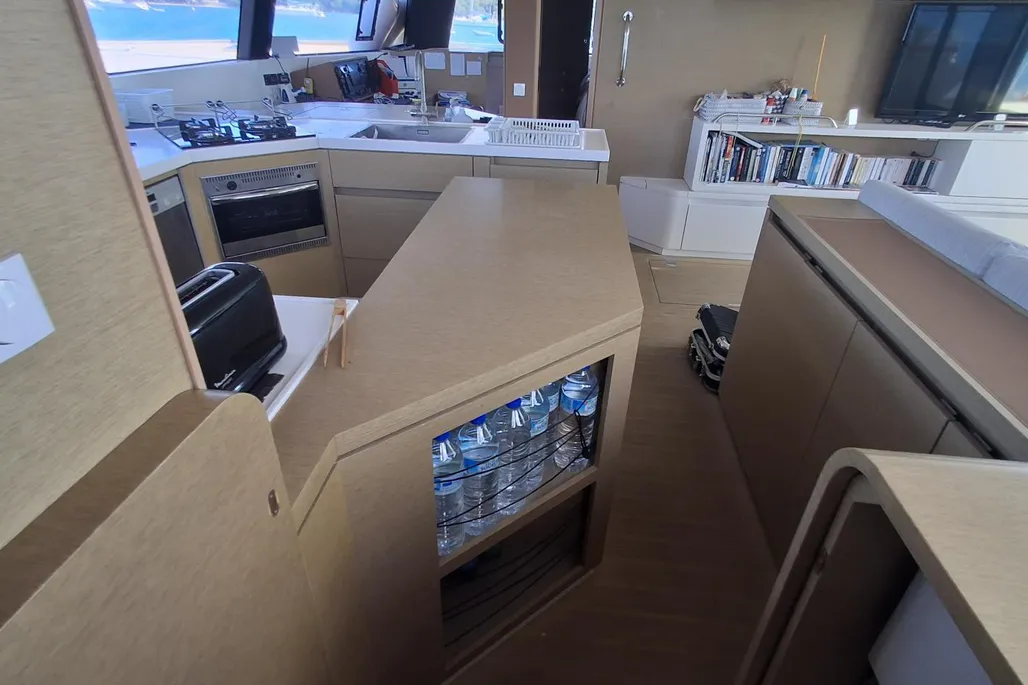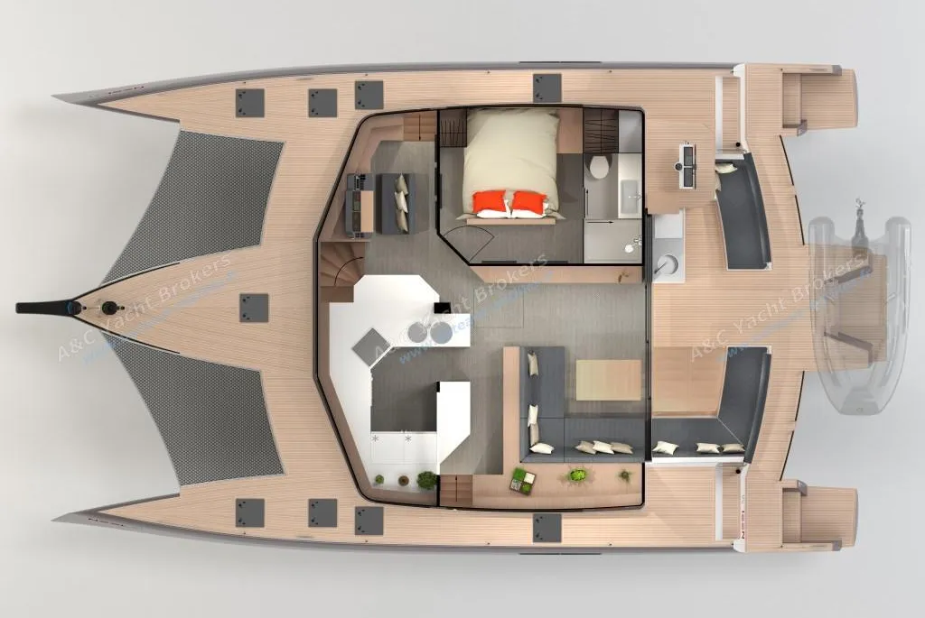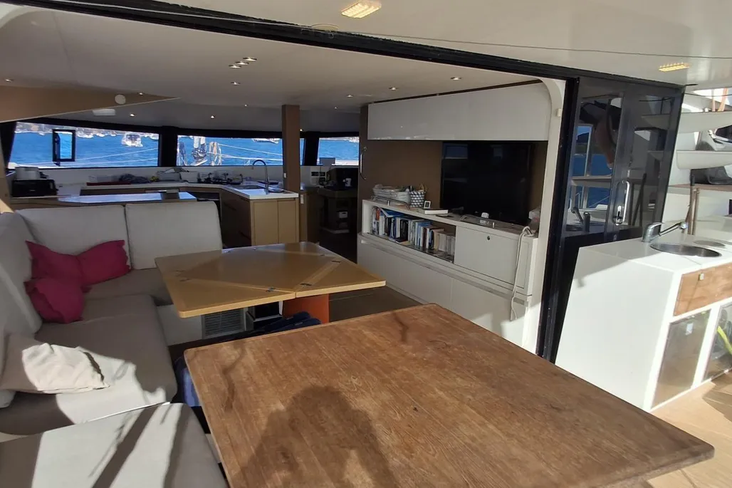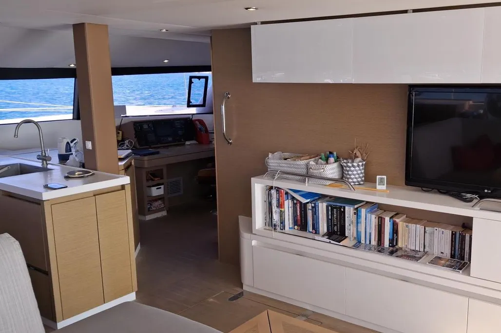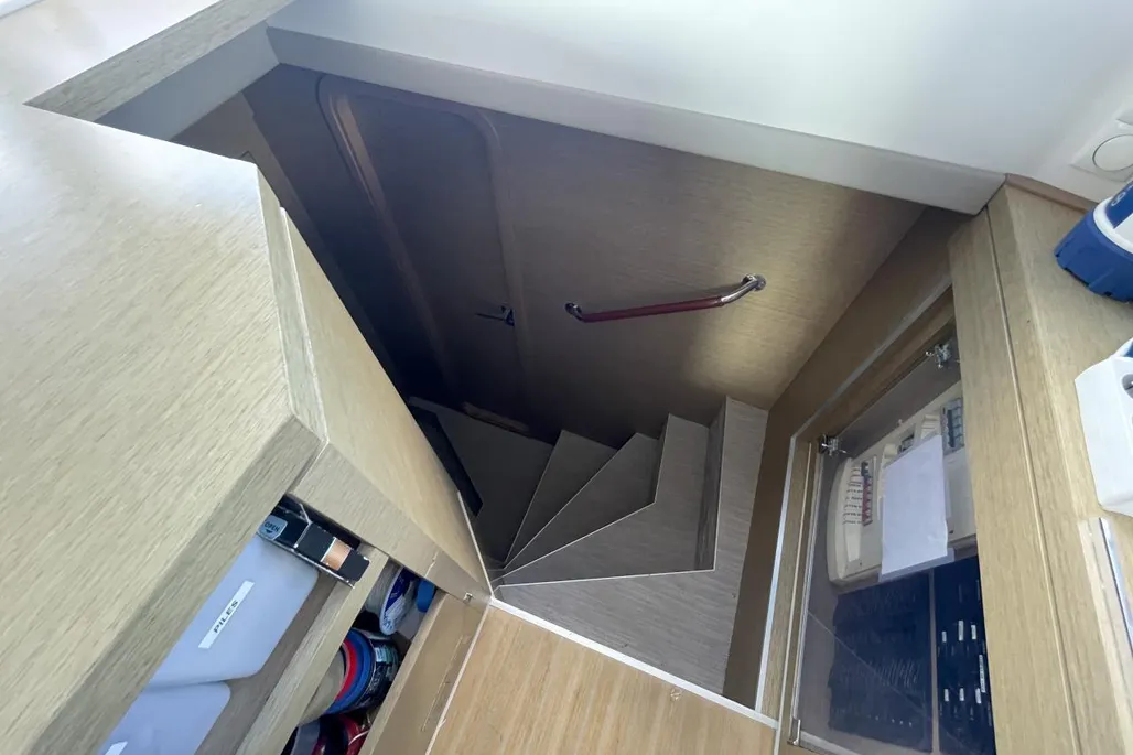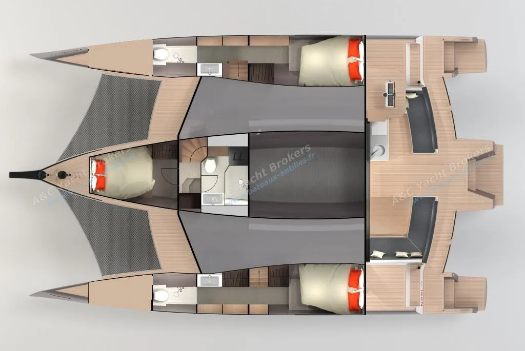 Une suite propriétaire au niveau du salon à tribord, salle de douche équipée d’une douche, d’un lavabo et d’un toilette électrique