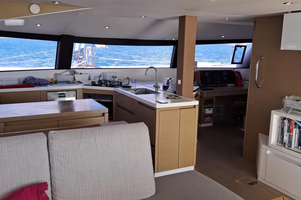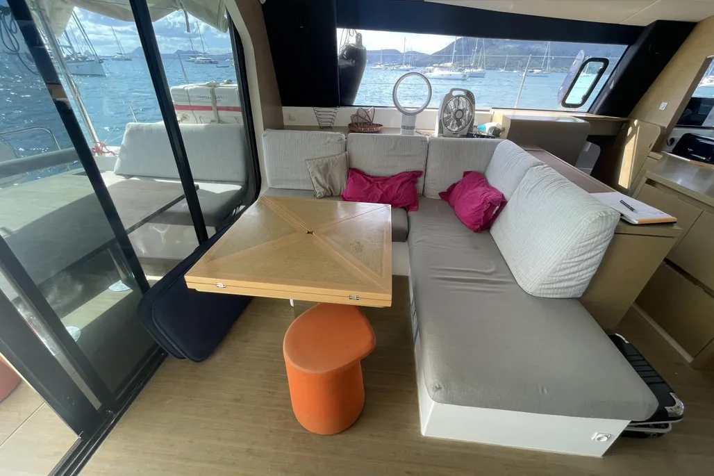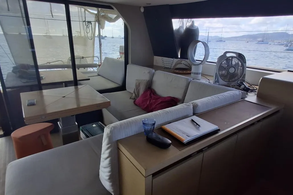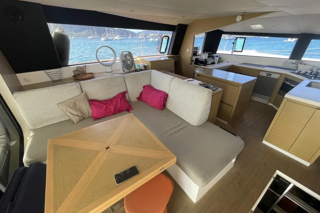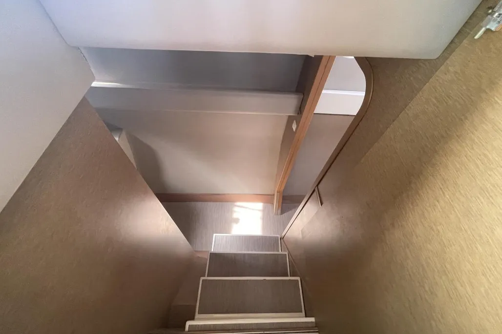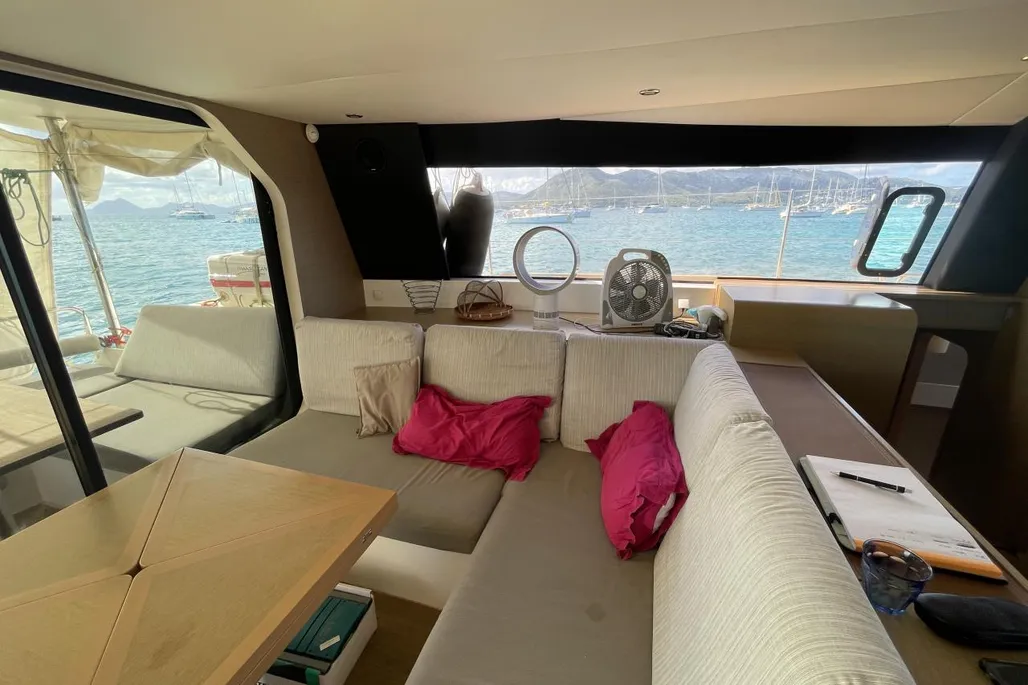 Une suite propriétaire au niveau du salon à tribord, salle de douche équipée d’une douche, d’un lavabo et d’un toilette électrique