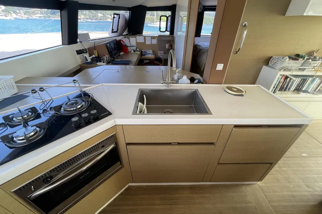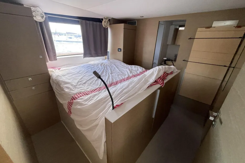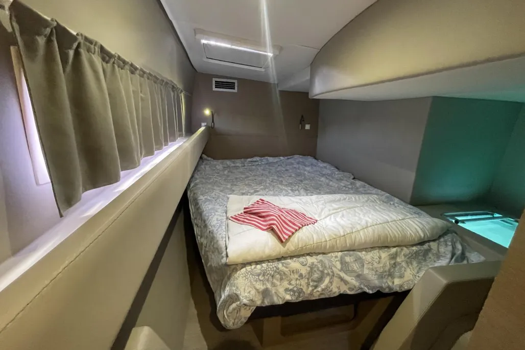 Une cabine de skipper simple dans un flotteur arrière tribord équipée d’un lavabo